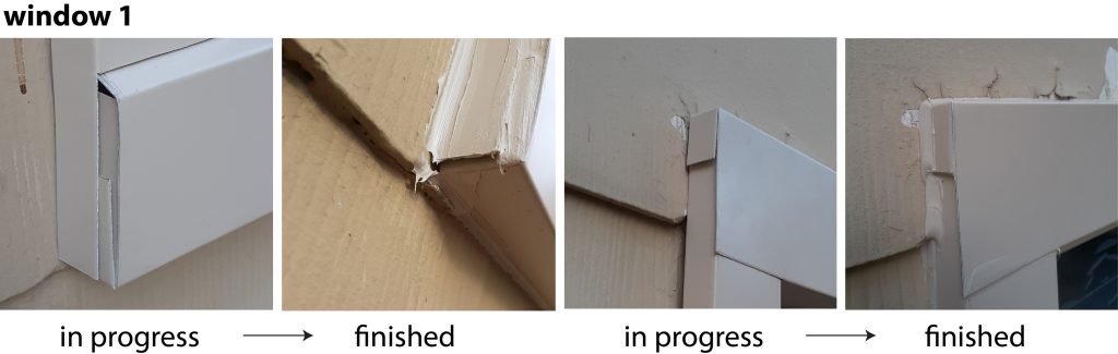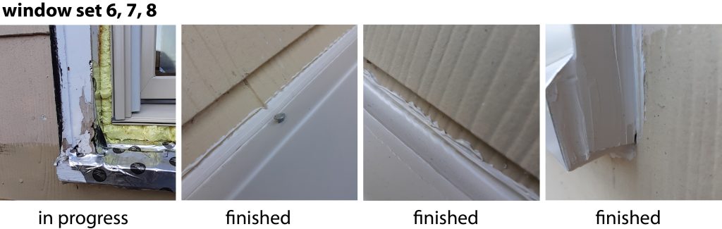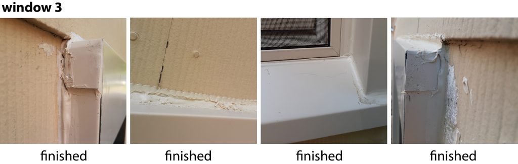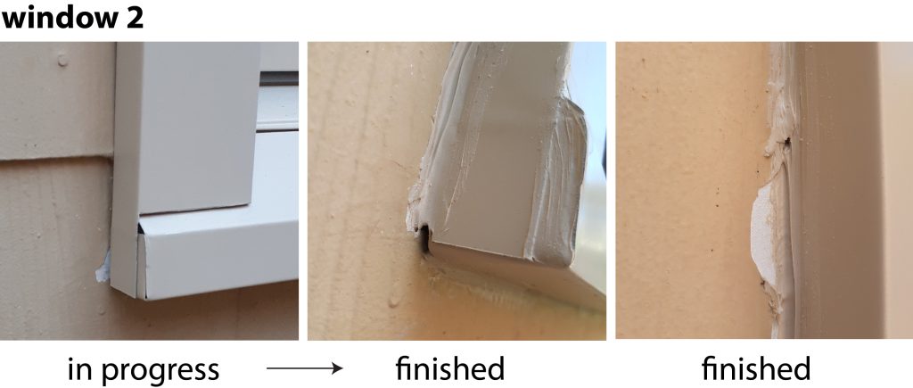 Window 3: Weird caulk patterns and piles at a top corner and on top of window. Caulk is already dirty on the day of installation.