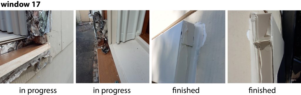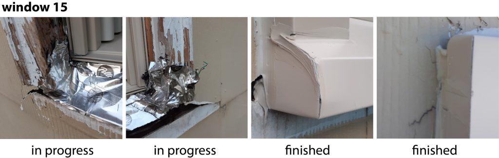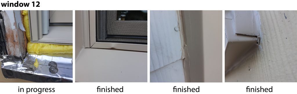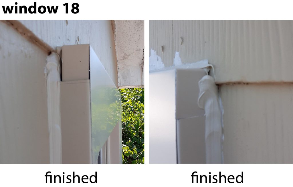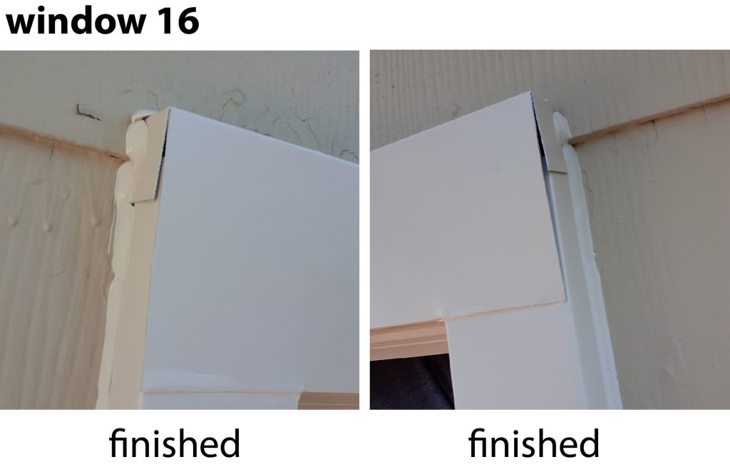 Window 16: Maybe I wasn’t supposed to notice that most of the upstairs windows are lacking caulk on those folded metal flaps.