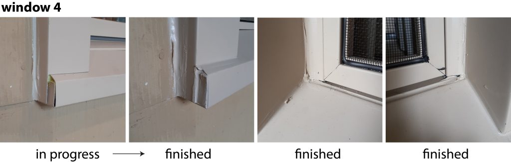 Window 1: Apparently the technique is to make metal flaps and to fold the metal over the exterior trim. Then caulk. Sort of. And to caulk to flaking paint rather than making a clean area next to the window to caulk against.