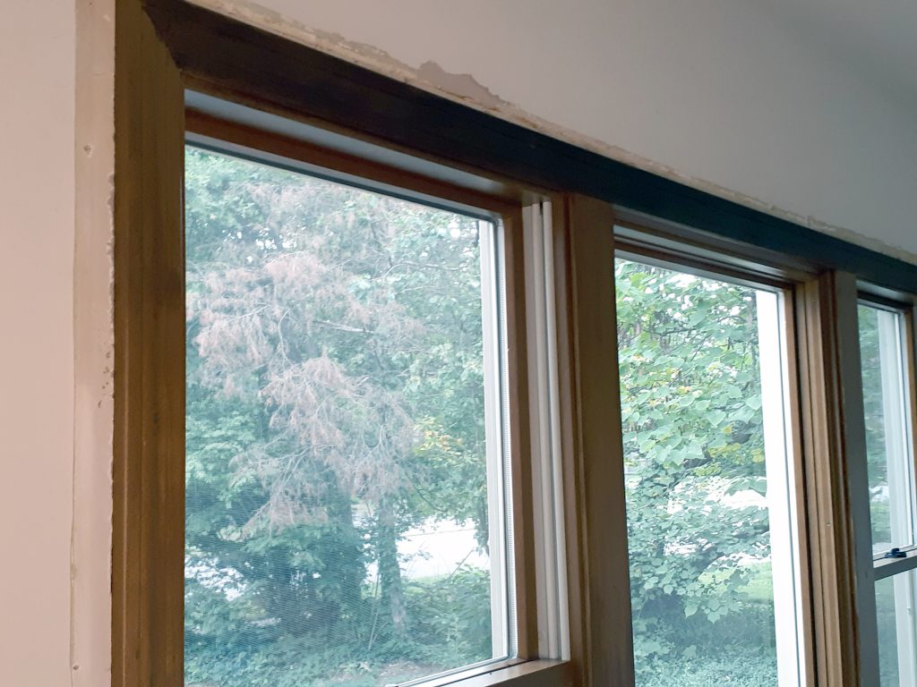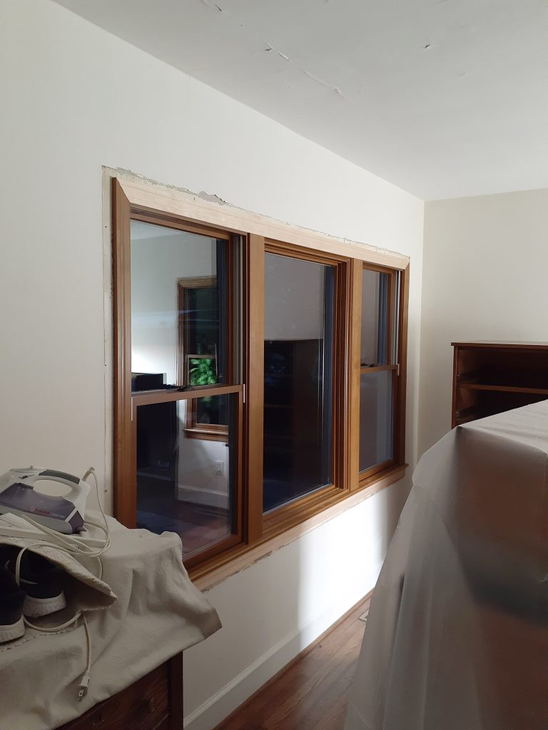The front room has a series of three windows positioned next to each other. Here are the new windows with the new interior trim: