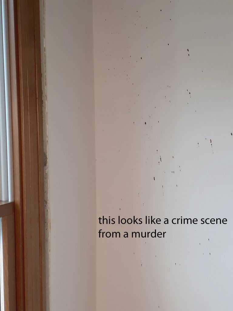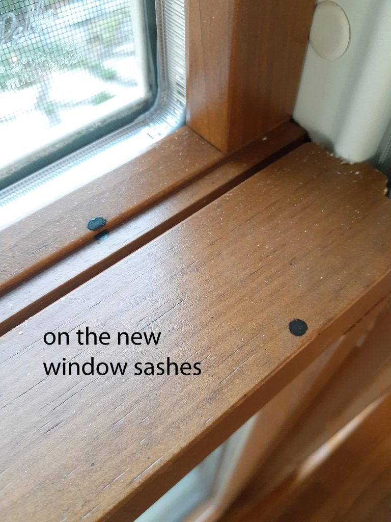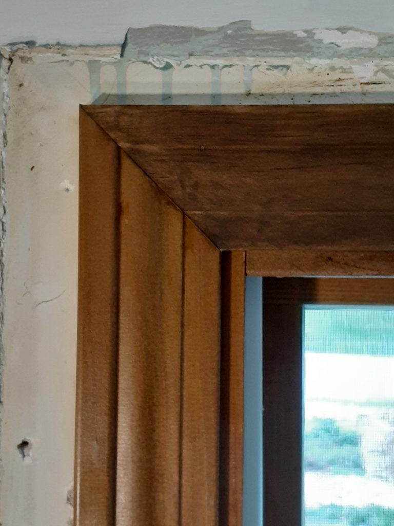 Note: And in case you are wondering, yes that is an unusually large gap of about an inch-and-a-half between the paint line at the edge of the old interior trim (and the paper of the drywall that was torn) and the new trim. The old trim was the same width as the new trim. All the windows are like this. The discrepancy is because these new insert windows are smaller than the old insert windows and because the trim seems to be positioned to cover more of the frame.