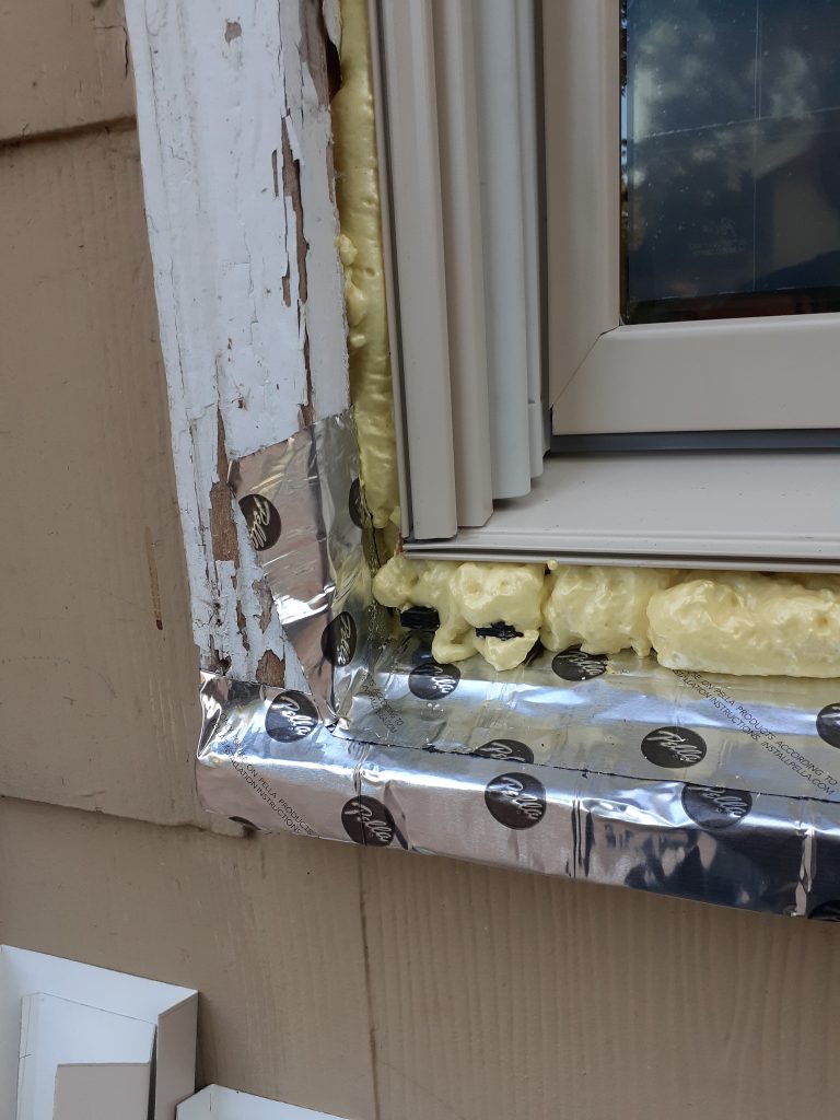 Within an hour or so I glanced up to see the state of the work. I was a bit confused in seeing exterior trim in place around a window opening where a new window had been set in place. I inquired about the trim and was told it would be “wrapped”. That made no sense to me and I was still confused, but because I am not a window installation expert I assumed that I just didn’t understand the process and the trim would be replaced later.